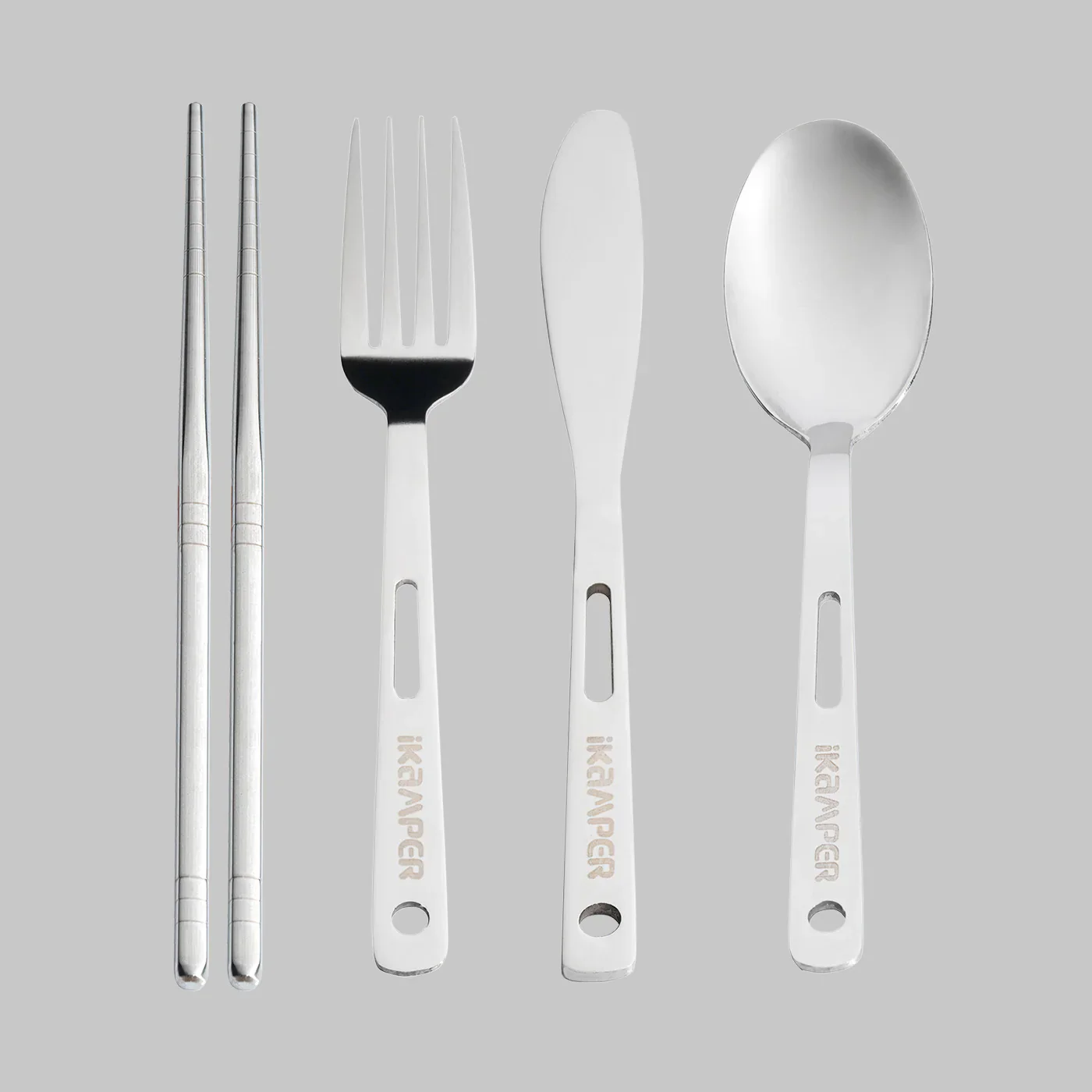 Set de 13 couverts pour vos repas lors de vos voyages. Comprend une paire de chopsticks (baguette). Les couverts en acier inoxydable vont au lave-vaisselle.